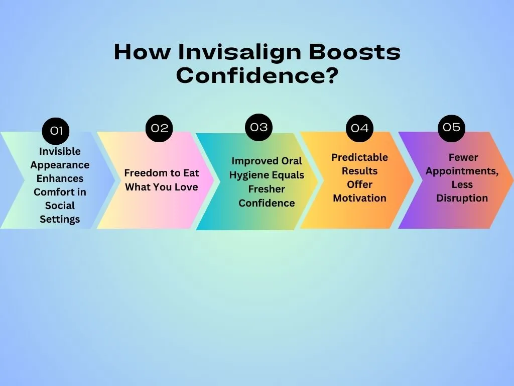 Following are the ways Invisalign boosts confidence by gently straightening teeth without the visibility of traditional braces, allowing you to smile freely throughout your treatment.